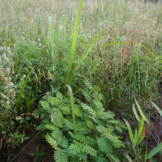 This winter, we hand-planted hundreds of patches of native prairie plants in a degraded edge of this prairie to rebuild diversity. On our way back to the house, we checked on the progress of some of these plantings. Left to right: Indian blanket (Amy's favorite flower), a patch of partridge pea (improves the soil and its seeds feed the bobwhites), and cowpen daisy (one of the best pollinator plants for sandy soils).